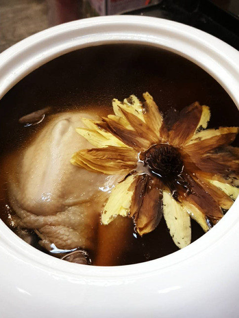 蓮花茶樹菇元盅雞湯,使用全雞燉煮增加特別的茶樹菇和多種菇類精燉養生鍋物,提供顧客最美味 / 鹽烤鮮活鮑